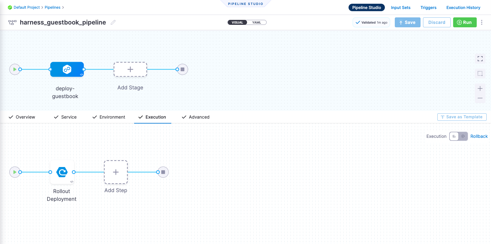 Harness CD pipelines allow you to orchestrate and automate your deployment workflows, and push updated application images to your target Kubernetes cluster. Pipelines allow extensive control over how you want to progress artifacts through various dev / test / stage / prod clusters, while running a variety of scans & tests to ensure quality and stability standards you and team may have defined.