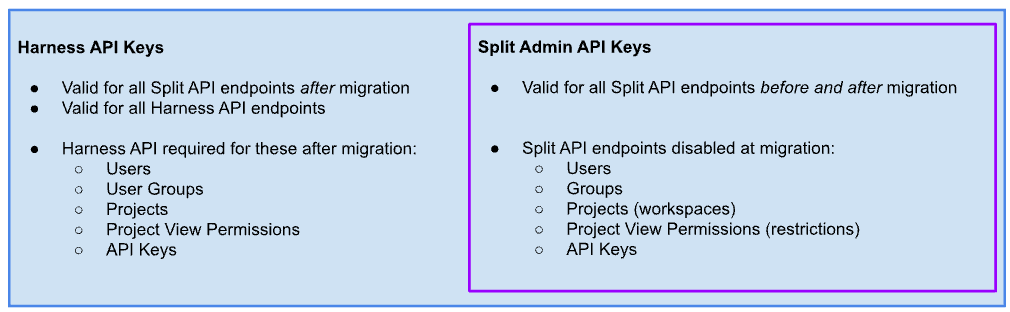 On your migration date, five Split Admin API endpoints will be disabled and replaced with new endpoints on the Harness platform. This is part of the migration of user, group, project, project view permissions, and Admin API key management to Harness’s standard platform features. These enhancements will give you greater account control and visibility.