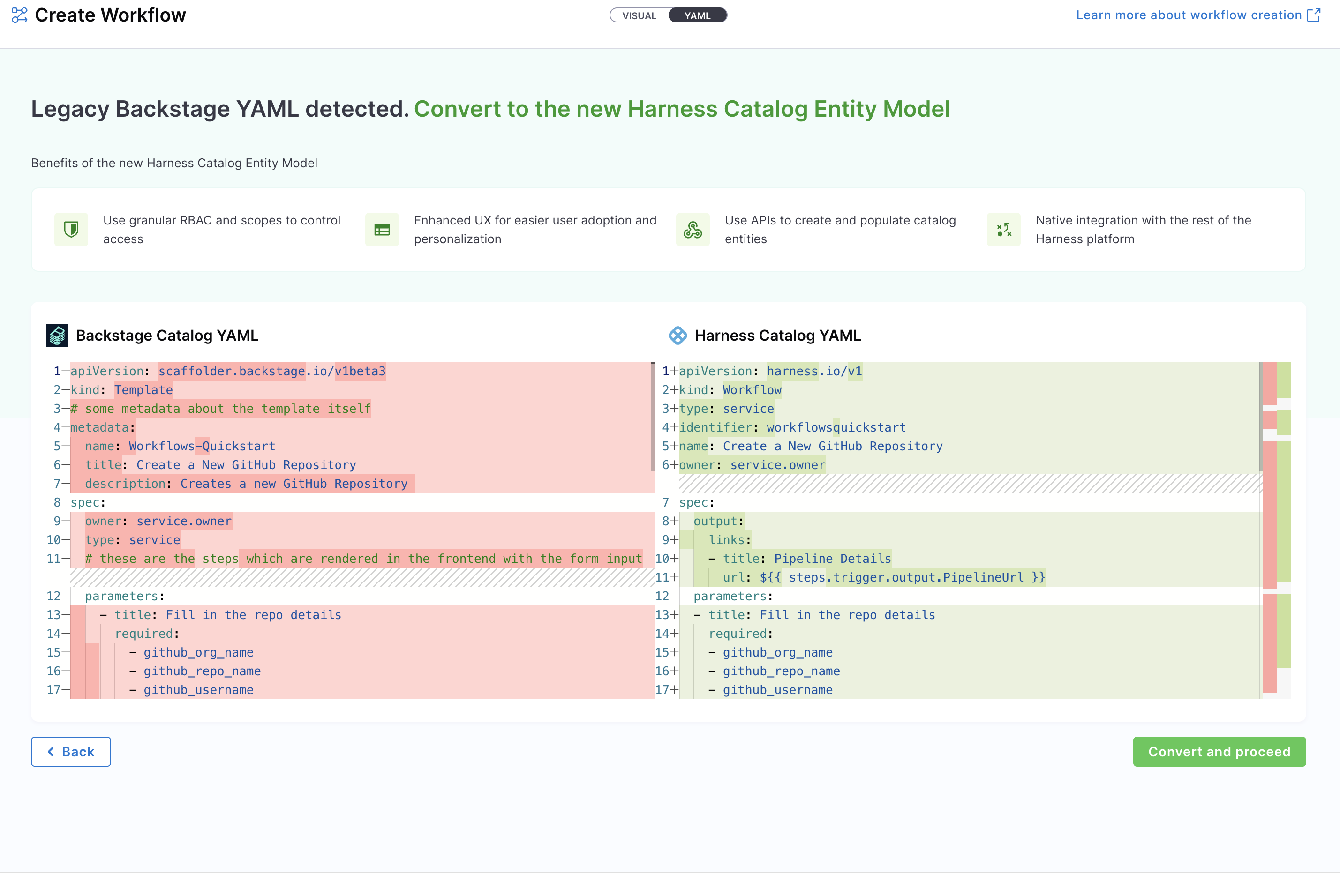 - Create a Workflow using your Workflow YAML: You can still create Workflows using your existing Workflow YAML files. Harness will automatically convert legacy Backstage YAML into the new Harness-native Data Model and register the corresponding Workflow.