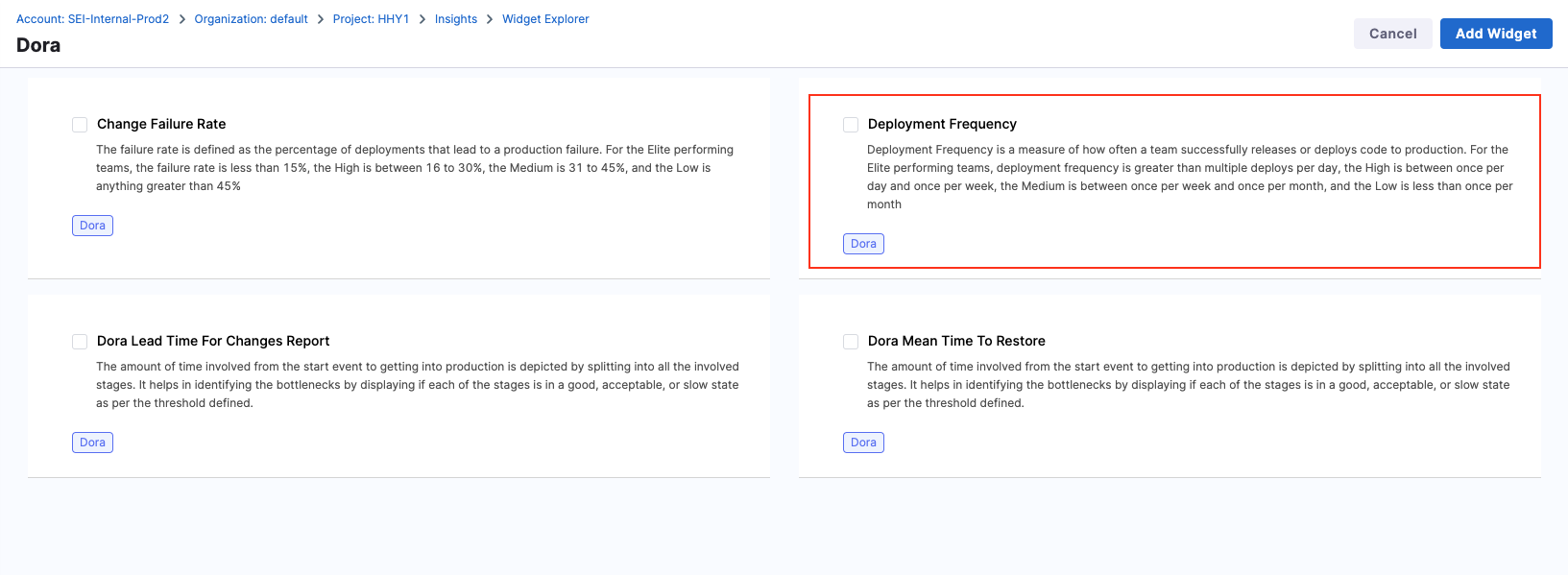 - Select the Deployment Frequency widget.