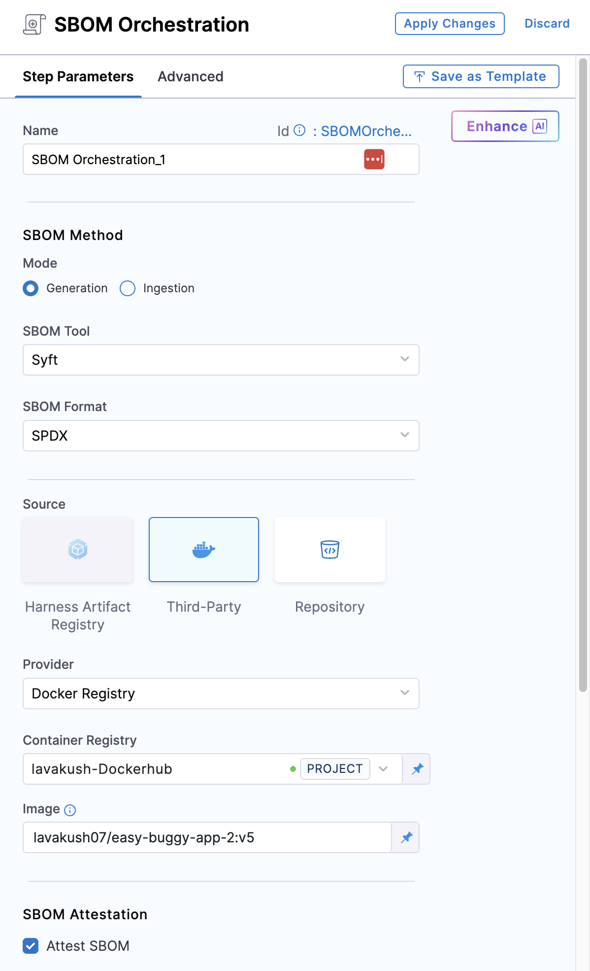To configure attestation, in addition to the above configuration, you need to enable the SBOM Attestation checkbox in the SBOM Orchestration step. Enabling SBOM Attestation is optional and not required for SBOM generation.