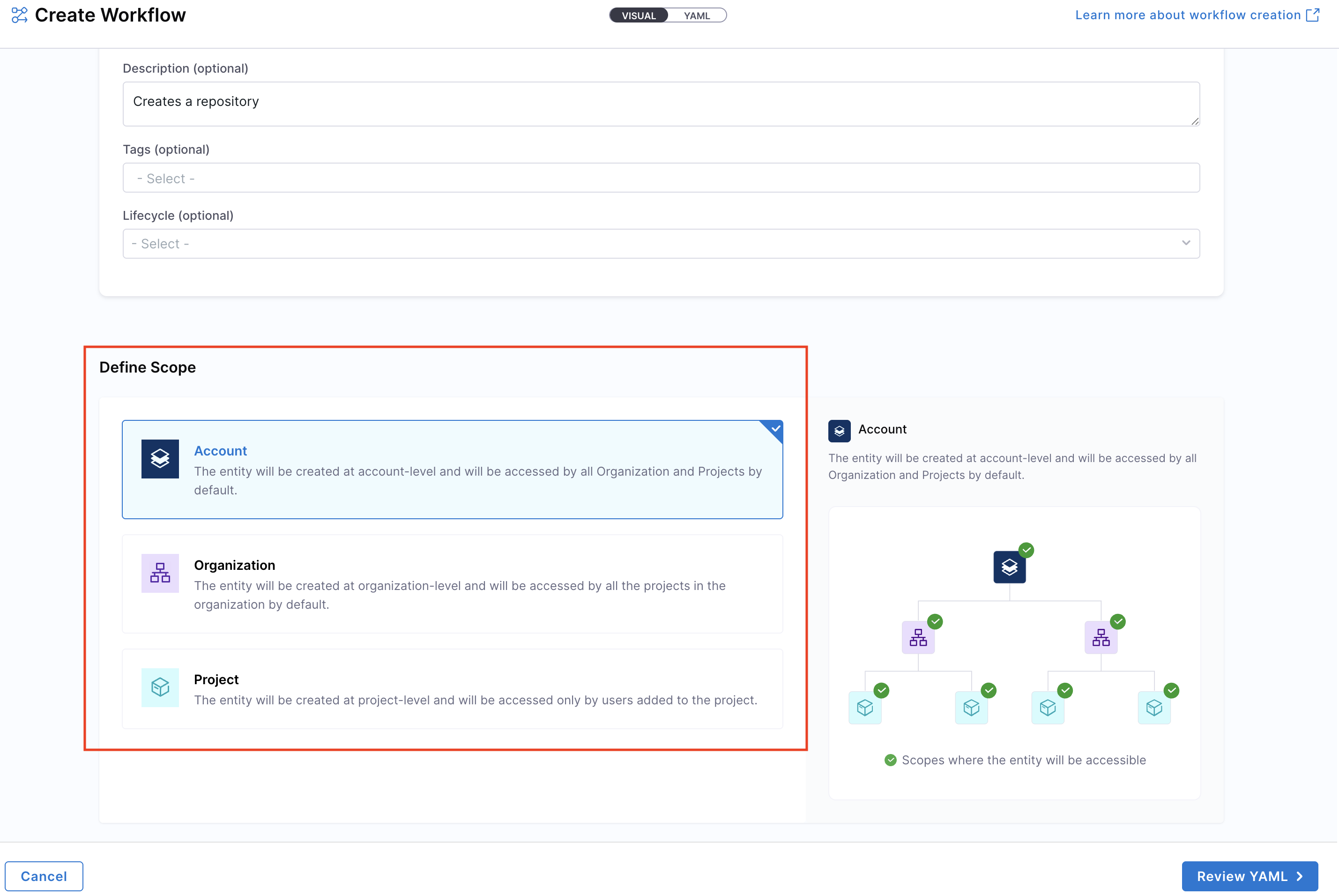 • Systems can be created at Account, Organization, or Project scope.